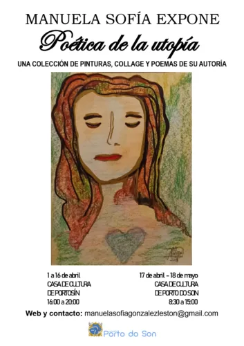 A Casa da Cultura de Portosín e a Casa de Cultura de Porto do Son acollerán a exposición ‘Poética de la Utopía’ de Manuela Sofía, unha colección de pinturas, collage e poemas da súa autoría. Do 1 ao 16 de abril, a Casa da Cultura de Portosín acollerá a mostra,