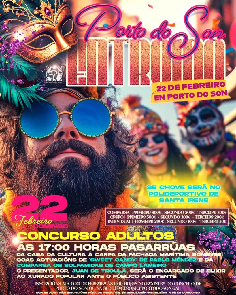 Así, o vindeiro domingo, 22 de febreiro, a partir das 17:00 h, terá lugar o concurso de adultos de disfraces que organizarase en tres categorías: individual, grupo e comparsas.