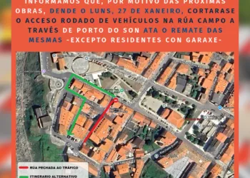 Informamos que, por motivo das próximas obras, dende o luns, 27 de xaneiro, cortarase o acceso rodado de... Read More CORTADO ACCESO RODADO DE VEHÍCULOS NA RÚA CAMPO A TRAVÉS DE PORTO DO SON