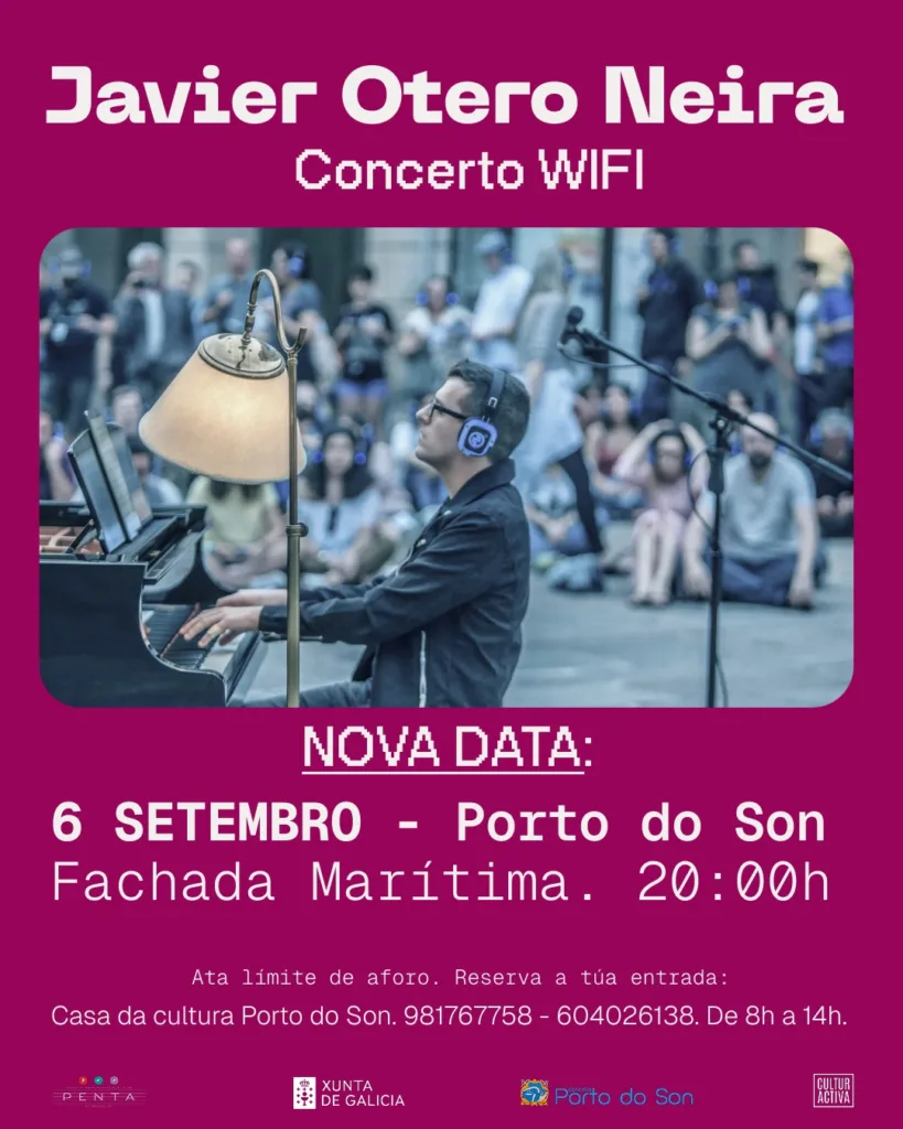 Por mor das malas previsións meteorolóxicas, o concerto Wifi de Javier Otero Neira programado para este sábado, 30 de agosto, foi APRAZADO para o vindeiro 6 DE SETEMBRO. Terá lugar na fachada marítima de Porto do Son a partir das 20:00 horas.