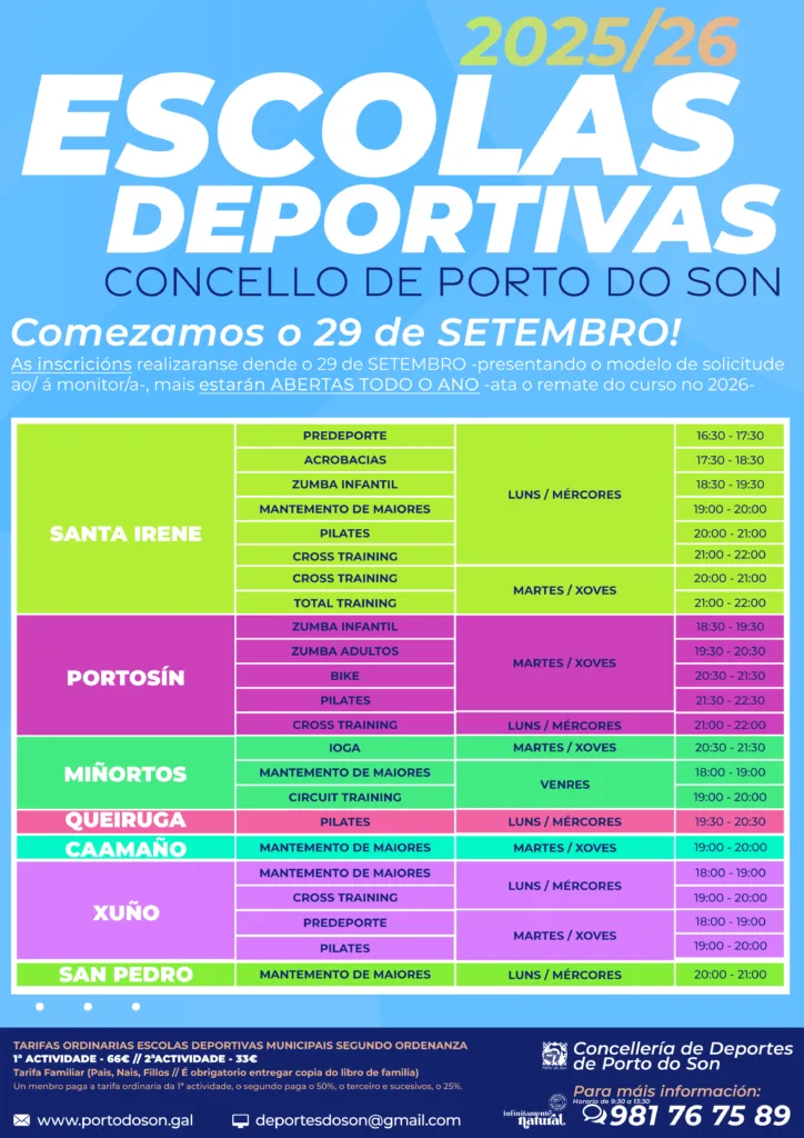 Tarifas ordinarias das Escolas Deportivas municipais segundo ordenanza.