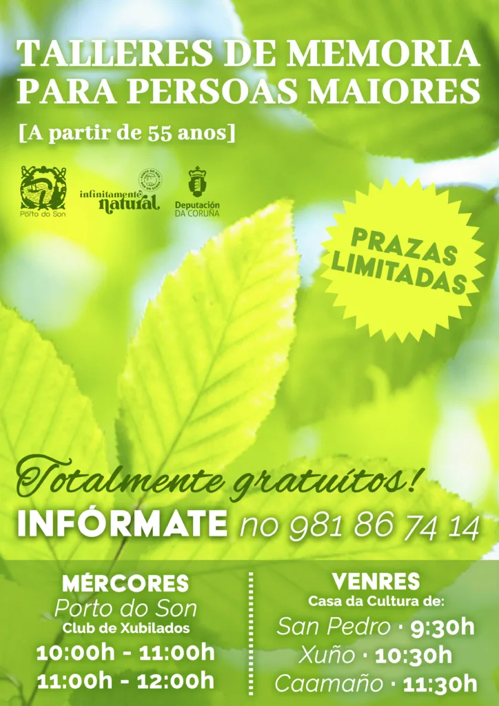 O Concello de Porto do Son impulsa os talleres de memoria para persoas maiores, un programa de balde no que os obxectivos principais son a estimulación cognitiva e a socialización para adultos de 55 anos en diante.