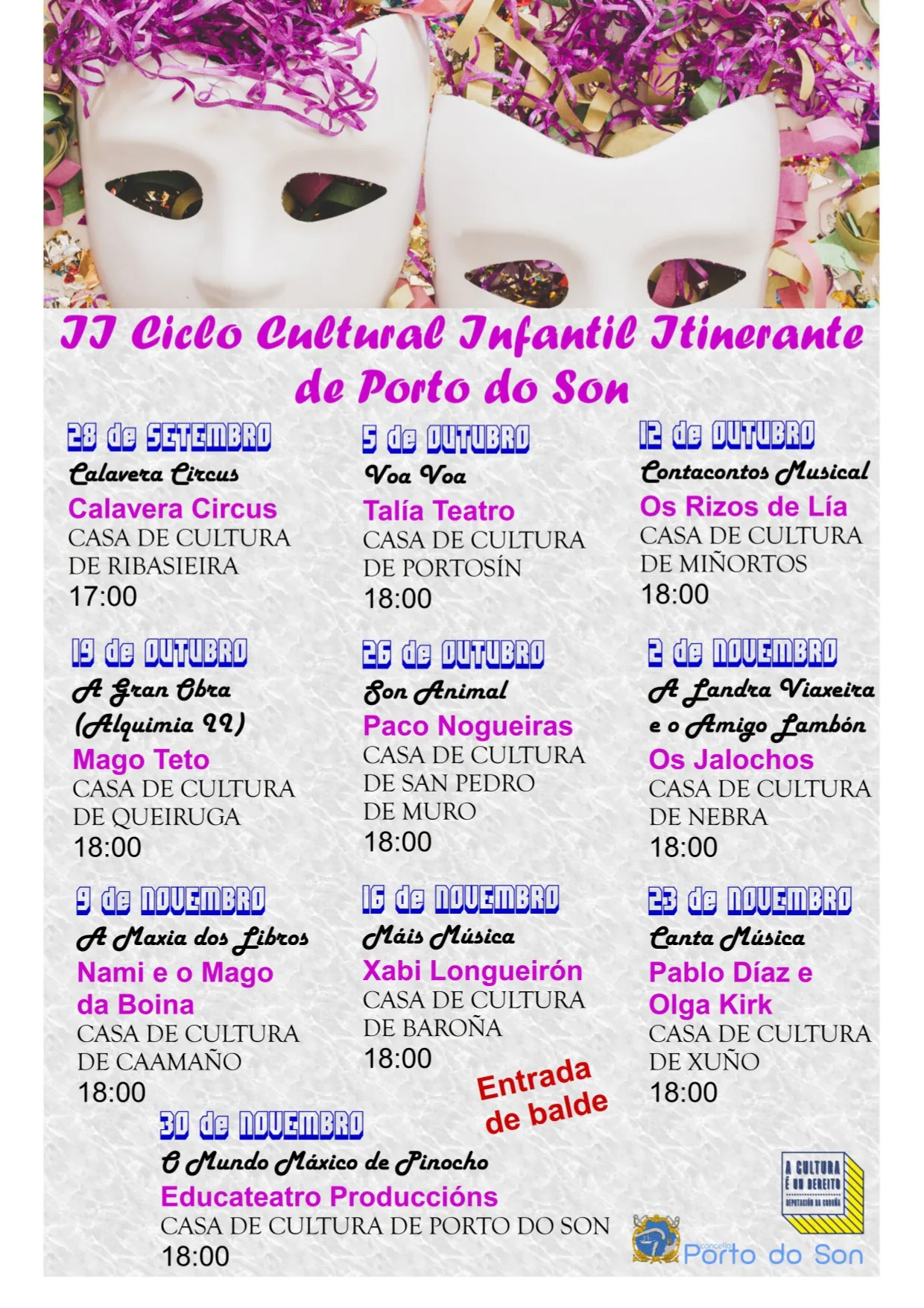 Do 28 de setembro ao 30 de novembro, Porto do Son acollerá o II Ciclo cultural infantil itinerante. Esta programación cultural levarase a cabo nas casas de cultura de todas as parroquias do municipio.