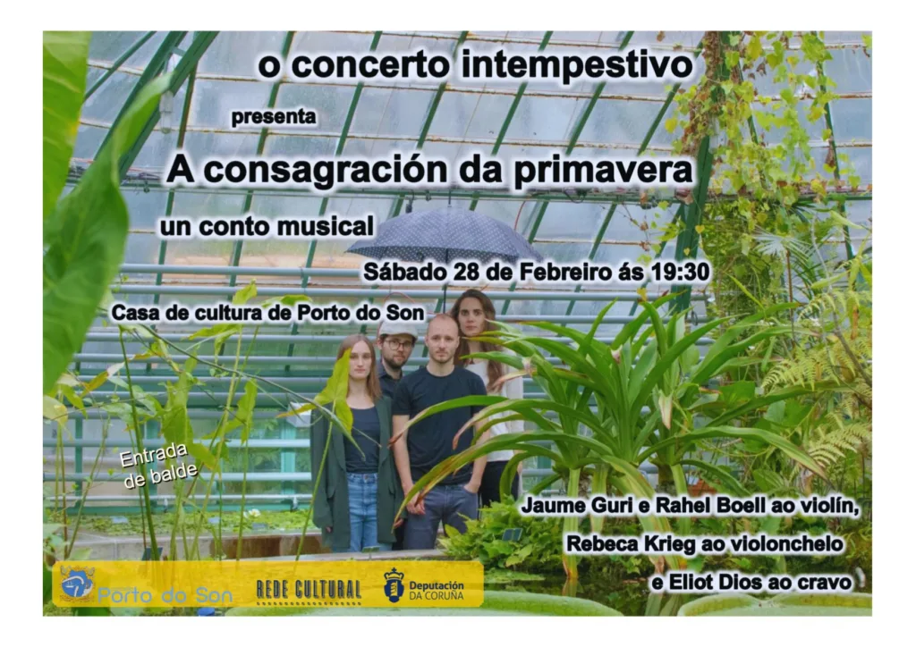 A Casa da cultura de Porto do Son acollerá o sábado 28 de febreiro, ás 19:30 h, a función ‘A Consagración da Primavera’ do grupo Il Concerto Intempestivo. O concerto ten entrada de balde ata completar aforo.
