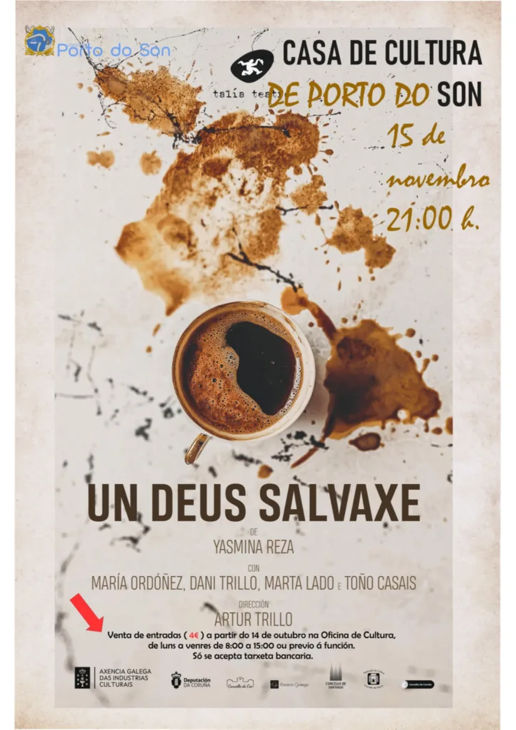 A Casa da Cultura de Porto do Son acollerá o vindeiro sábado, 15 de novembro, á partir das 21:00 h, a obra de teatro ‘Un deus salvaxe”, da compañía Talía Teatro.