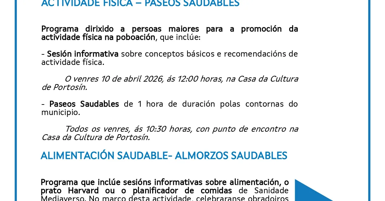 O venres 10 de abril, Portosín acollerá o Programa de promoción de Saúde da Xunta de Galicia, unha iniciativa destinada a persoas maiores.